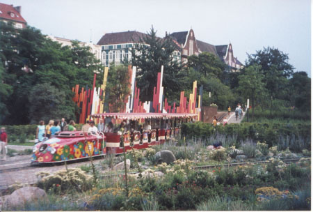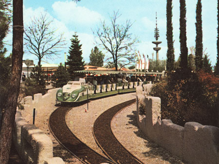 Diese Park-Eisenbahn löste die zuvor betriebene Kinder-Eisenbahn ab, die auf einem großen Oval den alten großen Spielplatz umrundete2). Einen Betriebshof gab es Tür die Spielplatzbahn nicht, nicht einmal eine Weiche. Nachts wurde der Zug einfach unter der überdachten Haltestelle abgestellt. Mit seiner VW-Käfer-Lok3> war dieser Zug durchaus ein Vorgänger der späteren Parkbahn. Nicht so die Kinder-Bahn, die später beim neuen großen Spielplatz mit den markanten Plastikbergen in der Nähe des Messegeländes betrieben wurde. Sie ist eher mit einem Jahrmarktfahrgeschäft zu vergleichen.